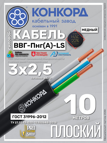 Кабель силовой ВВГ Пнг (А)-LS 3х2,5 ок(N, PE) - 0,66 ГОСТ 31996-2012 (Конкорд) 10м
