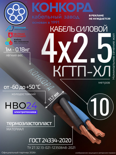 Кабель силовой гибкий КГ ТП-ХЛ 4х2,5 (N) 380/660-3 ГОСТ 24334-2020 (Конкорд) 10м