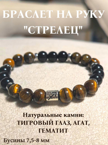 Браслет на руку Стрелец, Тигровый глаз, Черный Агат и Гематит