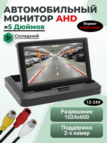 Монитор автомобильный AHD 5 дюймов для камеры заднего и переднего вида, универсальный (Поддержка форматов CVBS/AHD, 2 видеовхода AV/RCA), Складной