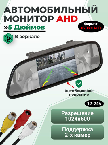 Монитор автомобильный AHD 5 дюймов для камеры заднего и переднего вида, универсальный (Поддержка форматов CVBS/AHD, 2 видеовхода AV/RCA), В зеркале