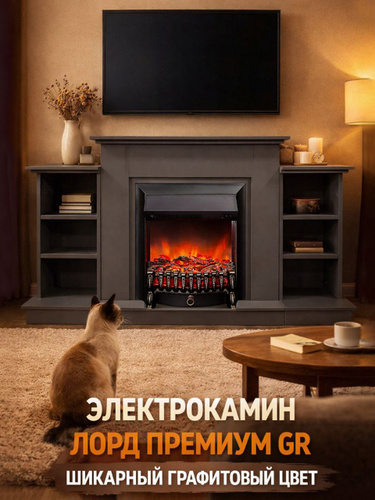 Электрокамин FLAMEKAMIN Лорд Премиум GR графит с очагом Fobos, 2 тумбы с полками, звук, обогрев, имитация пламени (камин электрический)