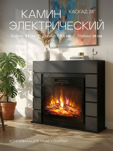 Камин электрический напольный Каскад 24 Антрацит c очагом, с обогревом, эффект звука потрескивания дров и живого пламени, пульт ДУ (Электрокамин)