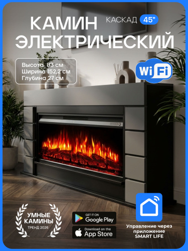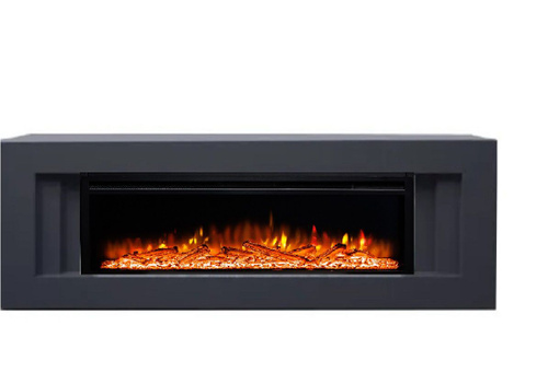Камин электрический Каскад Антрацит c панорамным очагом, настройка яркости, эффект звука потрескивания дров и живого пламени, обрамление (Электрокамин). Товар уцененный