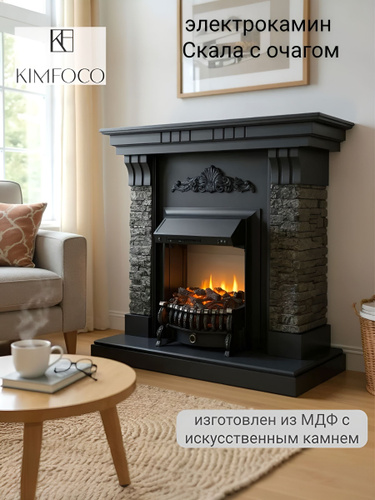 Камин электрический с декоративным камнем KIMFOCO Скала черный с очагом и порталом, пульт,эффект огня,обогрев,звук (электрокамин)
