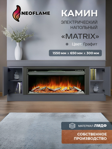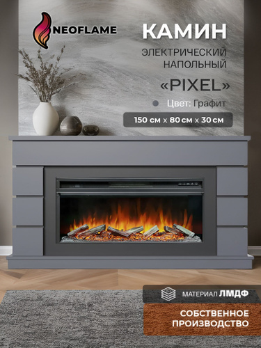 Камин электрический напольный декоративный PIXEL с очагом и порталом, с имитацией огня и звуком потрескивания дров (Электрокамин)