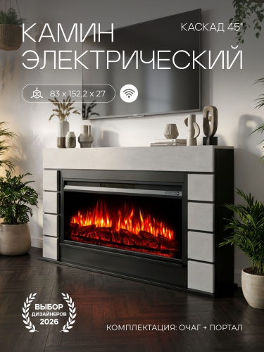 Камин электрический Каскад Шиншилла с очагом Премьер, эффект звука потрескивания дров и живого пламени, с обогревом