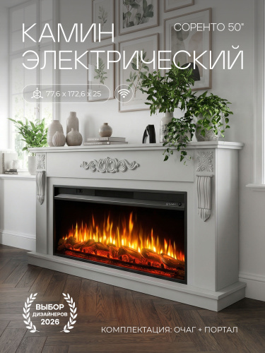 Камин электрический Соренто Серый, очаг Премьер 50, звук потрескивания дров, живого пламени + пульт ДУ (Электрокамин)