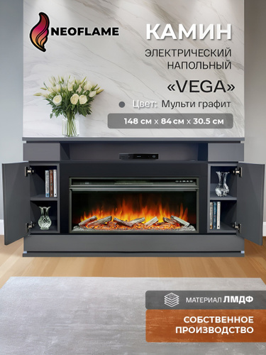 Камин электрический напольный декоративный с порталом, очагом, обогревом и имитацией живого огня Электрокамин VEGA