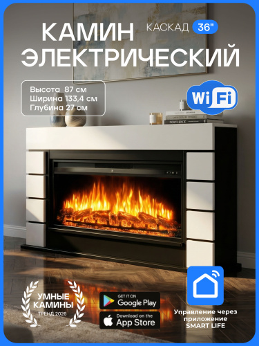 Камин электрический Каскад Белый Черный с очагом, эффект звука потрескивания дров и живого пламени, с обогревом
