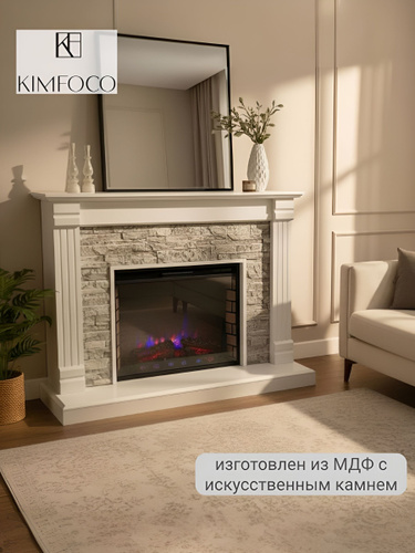 Камин электрический с декоративным камнем KIMFOCO Марра белый с электрическим очагом, пульт д/у, обогрев, имитация огня, напольный