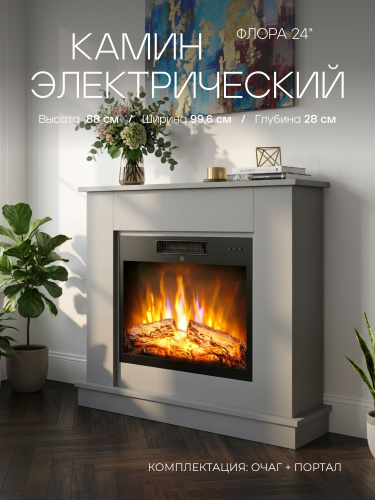 Камин электрический декоративный с обогревом напольный Флора 24 Серый c очагом, эффект звука потрескивания дров и живого пламени, пульт ДУ (Электрокамин)