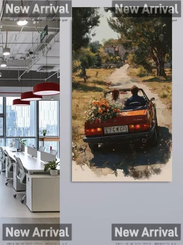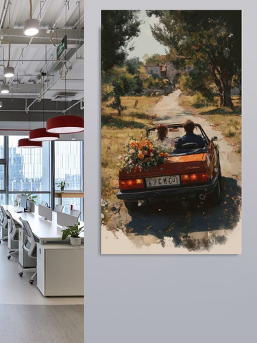 Картина "Печатная картина на холсте Молодожены в кабриолете на деревенской дороге 50 х 90" 50x90 см