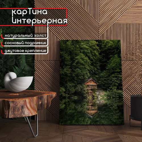 Картина интерьерная на холсте, вертикальная - Домик у озера в лесу 75x100 см