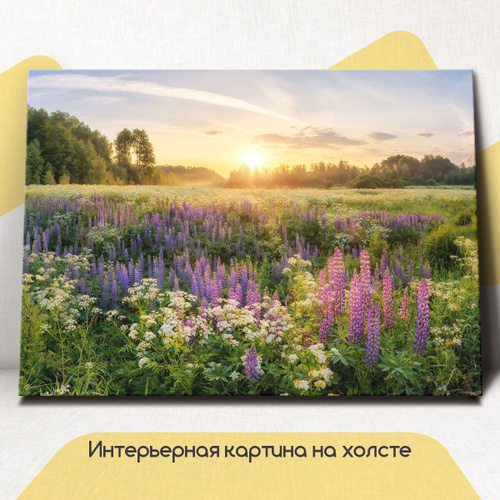 Картина интерьерная на стену, на холсте горизонтальная - Пейзаж поле с люпинами, цветы летний луг 75x100 см
