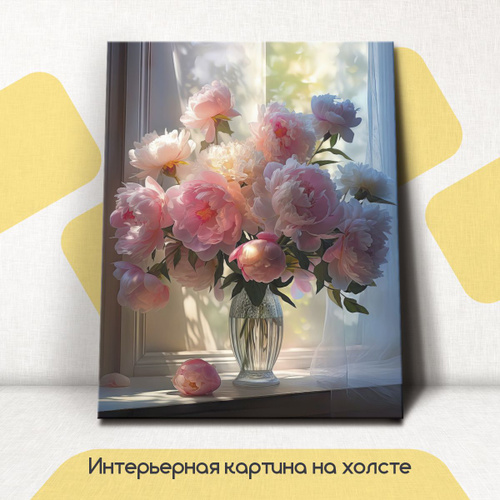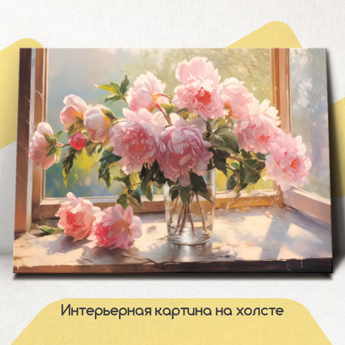 Картина интерьерная на стену, на холсте горизонтальная - Натюрморт пионы у окна 75x100 см