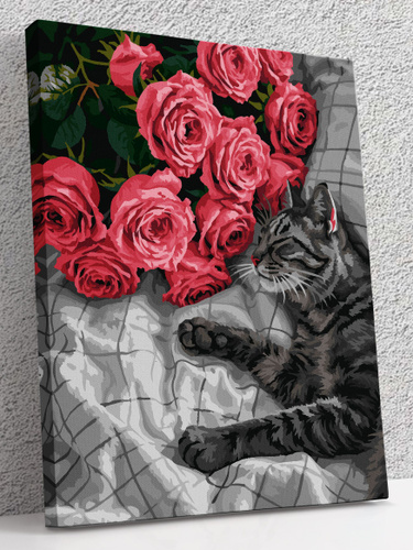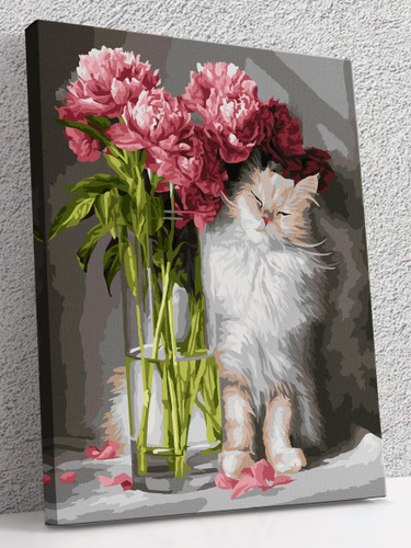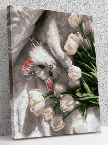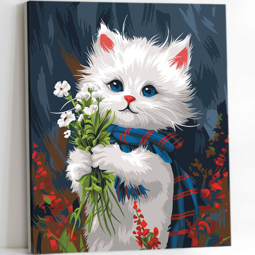 Картина по номерам на холсте с подрамником 40х50 "Букетик для тебя кот, кошка, кошечка, котенок"