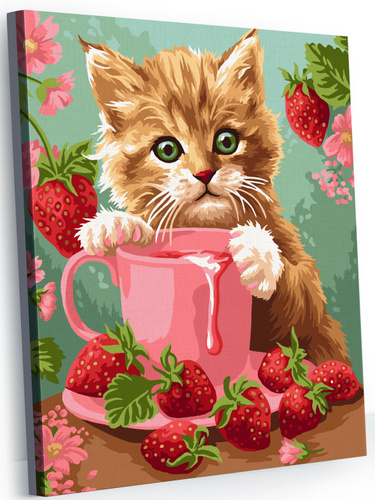 Картина по номерам на холсте с подрамником 40х50 "Котенок с клубникой кот, кошка, кошечка"