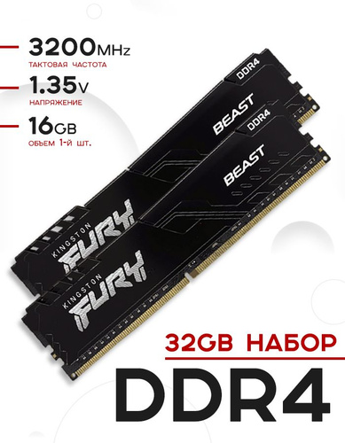 Kingston Fury Оперативная память Beast Black DDR4 32Gb (2x16Gb) 3200 MHz DIMM 2x16 ГБ (KF432C16BBK2/32)