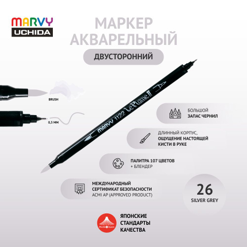 Маркер Marvy Uchida для скетчинга акварельный двусторонний (кисть/капиллярная ручка 0.3мм) серебристо серый MAR1122/26
