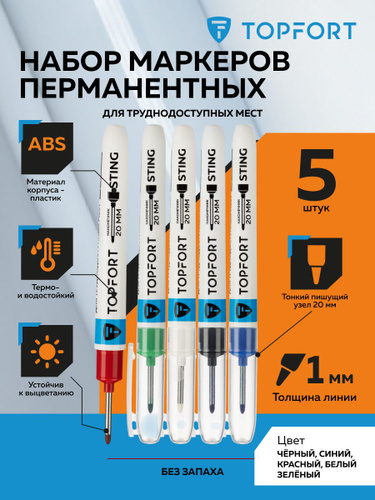 Маркер краска перманентный, тонкий TOPFORT, для универсальной маркировки, 1 мм, 5 цветов