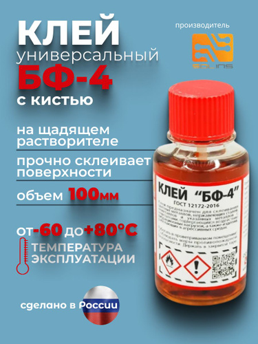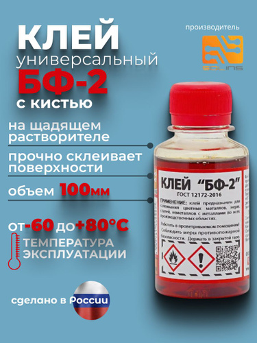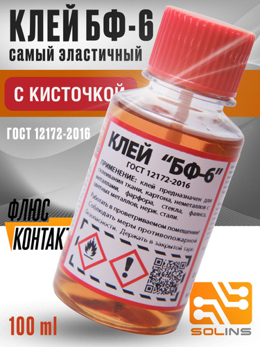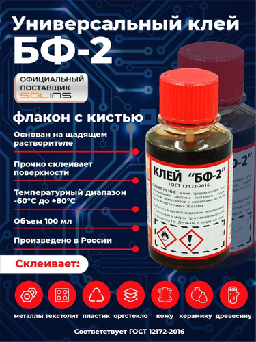 Клей БФ-2 SOLINS универсальный для металла, алюминия, керамики, ткани, стали, пластиков, стекла, дерева, кожи, водостойкий, морозостойкий 100 мл