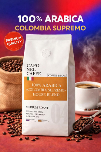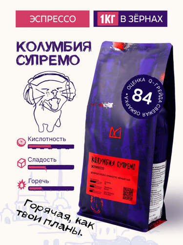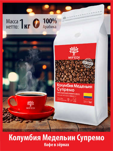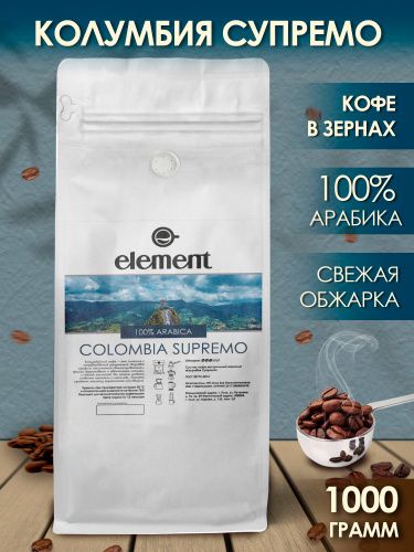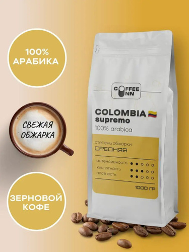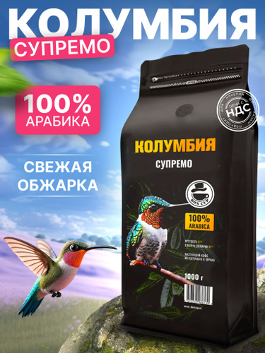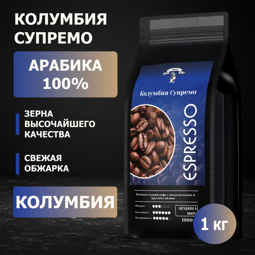Кофе в зернах 1 кг Колумбия Супремо, 100% арабика, средняя обжарка, 1кг, эспрессо-смесь