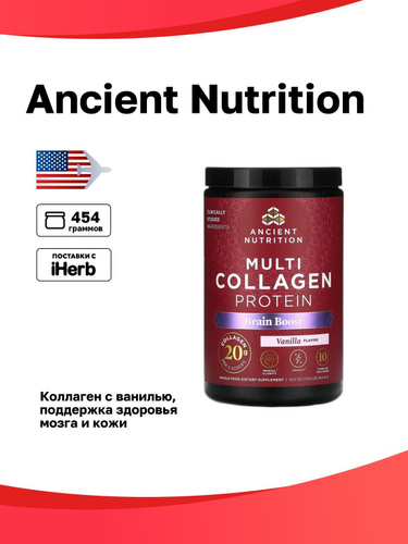 Ancient Nutrition, Multi Collagen Protein, Brain Boost, ваниль, 454,5 г (1 фунт)
