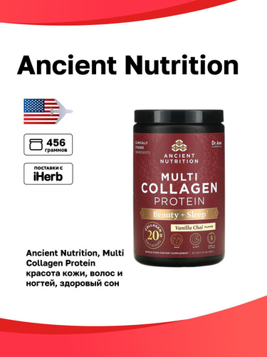 Ancient Nutrition, Multi Collagen Protein, протеин с коллагеном, для красоты и сна, ванильный чай, 456 г (1 фунт)