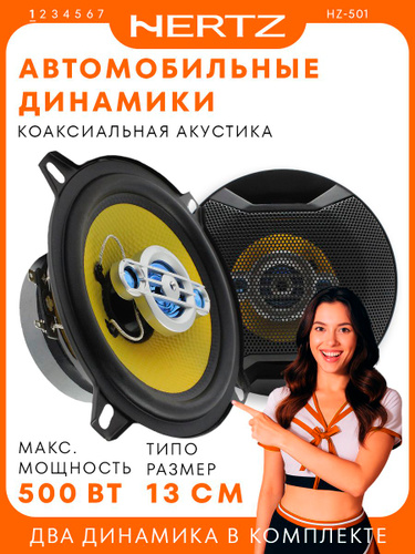Автомобильные динамики HERTZ "HZ-501" / 13 см (5 дюйм.), макс. мощность 500 вт., комплект из 2 штук c сетками и проводами, 4-полосные / Подарок мужчине, на новый год, на 23 февраля