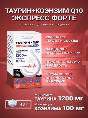 Таурин + Коэнзим Q10 Экспресс Форте от Витаукт 1200 мг для энергии и укрепления сердечно-сосудистой системы. Нормализует артериальное давление и сердечный ритм. Производитель Vitauct, 43 г