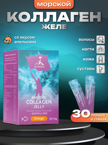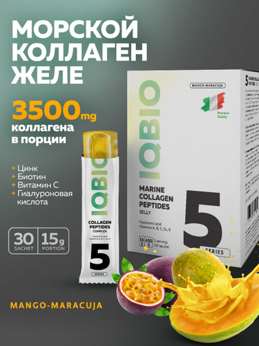 Морской коллаген в желе IQBIO, вкус Манго-Маракуйя, биотин, цинк и витамин С, рыбий коллаген для суставов, кожи волос и ногтей, 30 саше. Marine collagen jelly.