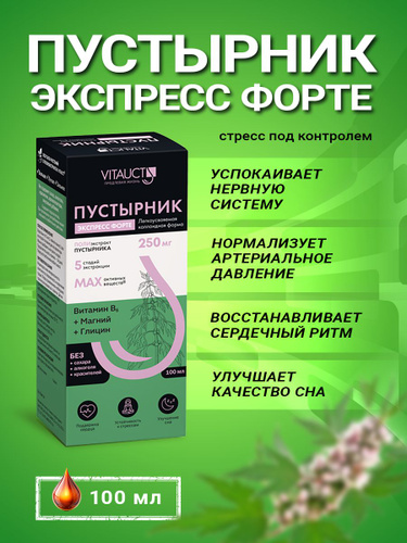 Пустырник от Витаукт успокоительное средство с глицином, магнием и витамином В6 для снижения стресса и тревожности. Способствует нормализации сна и нервной системы. Производитель Vitauct, 100 мл