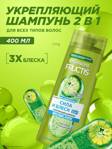 Garnier Fructis Шампунь для волос, "Фруктис, Сила и Блеск 2в1", укрепляющий, для нормальных волос, 400 мл с Экстрактом Грейпфрута
