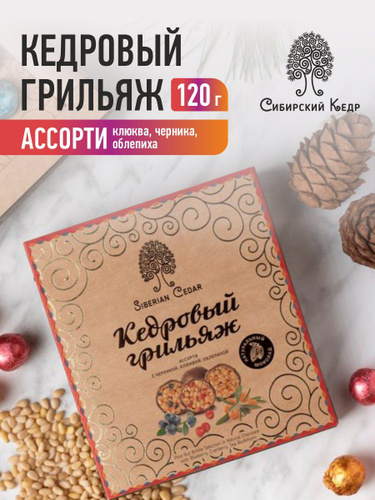 Конфеты Кедровый грильяж Сибирский кедр в натуральном темном шоколаде ассорти: клюква, черника, облепиха 120г
