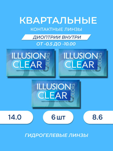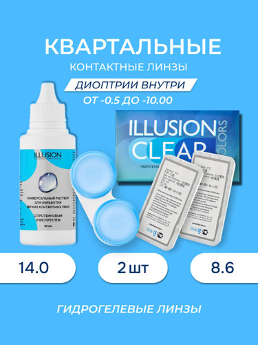 Линзы контактные мягкие ILLUSION colors / Иллюжн калорс, пробный набор (линзы квартальные Clear / Клиа 2 шт. Раствор 60 мл.) -0.75