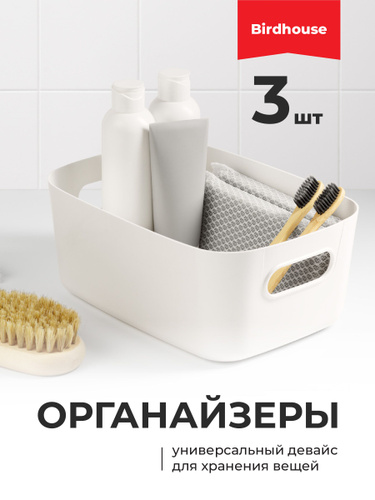 Birdhouse, Ящик пластиковый для хранения в ванной / Органайзер для косметики и мелочей, Набор 3 шт, Белый