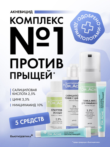 БьютиЦевтика Пенка для умывания от прыщей + набор для проблемной кожи подростков АКНЕВИЦИД (Точечный крем против высыпаний, Салициловый лосьон, Тоник против прыщей и акне, Умывалка - мусс для лица)
