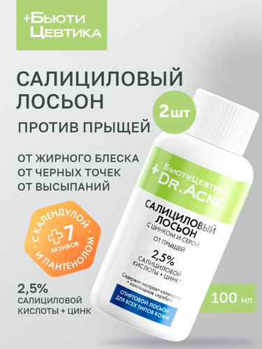 Anti-Acne салициловый спиртовой лосьон БьютиЦевтика от прыщей, чёрных точек и воспалений, с цинком и серой, 100 мл, 2 шт