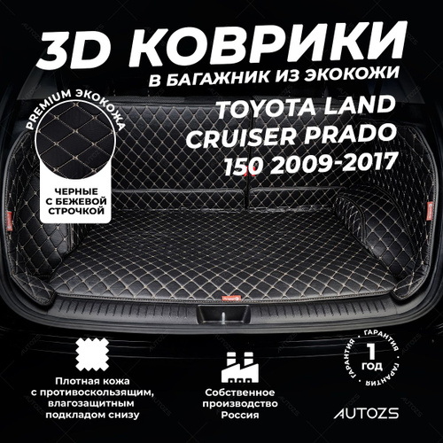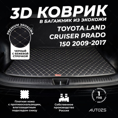 Кожаный 3D коврик в багажник Toyota Land Cruiser Prado 150 5 дв. 5 мест (2009-2017) базовый Черный с бежевой строчкой