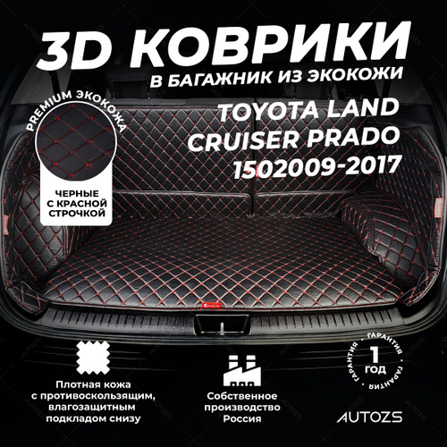 Кожаный 3D коврик в багажник чехол Toyota Land Cruiser Prado 150 5 дв. 7 мест (2009-2017) Полный комплект (с боковинами) Черный с красной строчкой