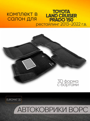 Коврики текстильные 3D Euromat для Toyota Landcruiser Prado 150 (2013-2022)/ 3Д Евромат Тойота Ленд Крузер Прадо 150, с металлическим подпятником, черные