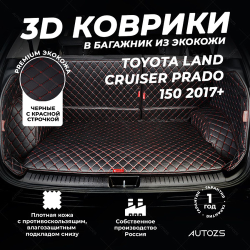 Кожаный 3D коврик в багажник чехол Toyota Land Cruiser Prado 150 5 дв. 7 мест Рестайлинг 2 (2017+) Полны й комплект (с боковинами) Черный с красной строчкой