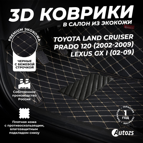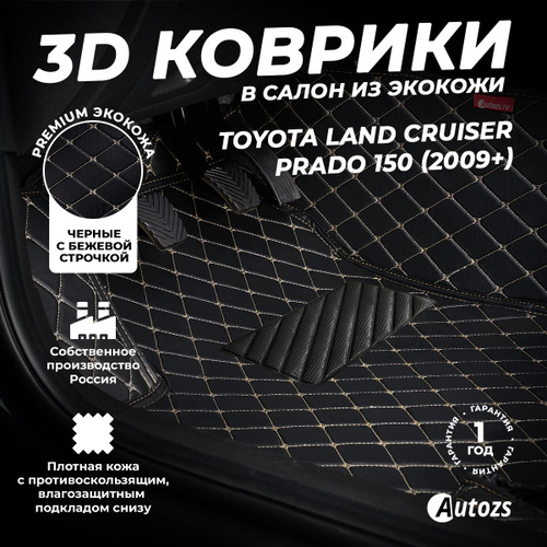 Коврики для Тойота Ленд Крузер Прадо 150 (2009-2017). Автоковрики, полики Toyota Land Cruiser Prado 150 (1 поколение), экокожа со съемным текстилем 3D/5D, Черный с бежевой строчкой