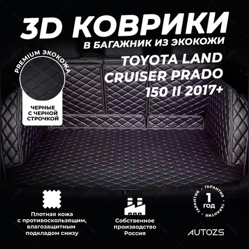 Кожаный 3D коврик в багажник чехол Toyota Land Cruiser Prado 150 Рестайлинг 2 (2017+), 7 мест Полный комплект (с боковинами) черный с черной строчкой / 3Д ковры в автомобиль