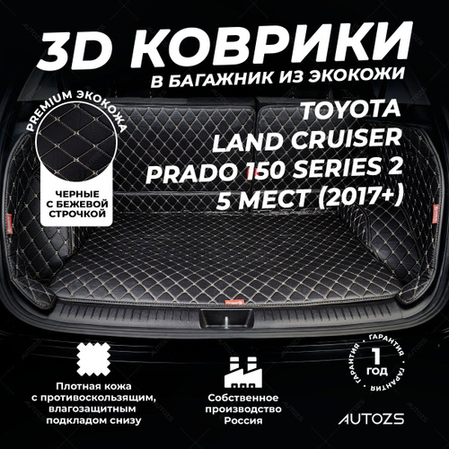 Кожаный 3D коврик в багажник чехол Toyota Land Cruiser Prado 150 Series 2, 5 дверей 5 мест (2017+), Полный комплект (с боковинами) Черные с бежевой строчкой