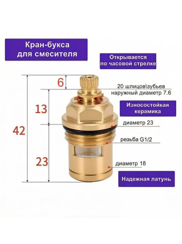 Кран-букса для смесителя, керамическая, 20 шлицов (зубьев), M20*1.5 - G1/2, h42 мм