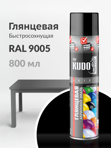 Аэрозольная краска KUDO "Эмаль универсальная быстросохнущая RAL в большом баллончике" Акриловая, Глянцевая, 0.8 л, Черная RAL 9005