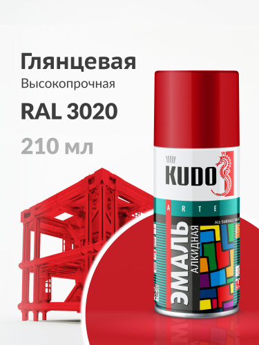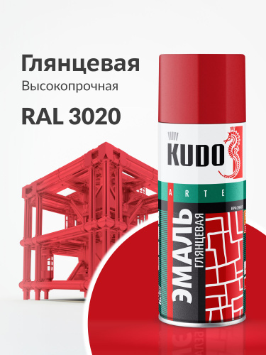 Аэрозольная краска KUDO "Эмаль универсальная высокопрочная RAL в баллончике", Алкидная, Глянцевая, 0.52 л, Красная RAL 3020, KU-1003
