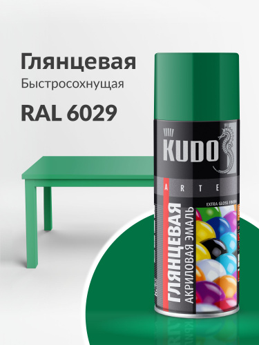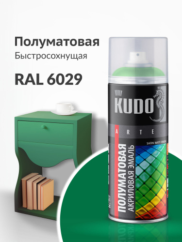 Краска акриловая аэрозольная в баллончике сатин RAL 6002 зеленая листва KUDO, быстросохнущая, полуматовое покрытие, 520 мл/для металла, дерева, пластика, окрашенных поверхностей